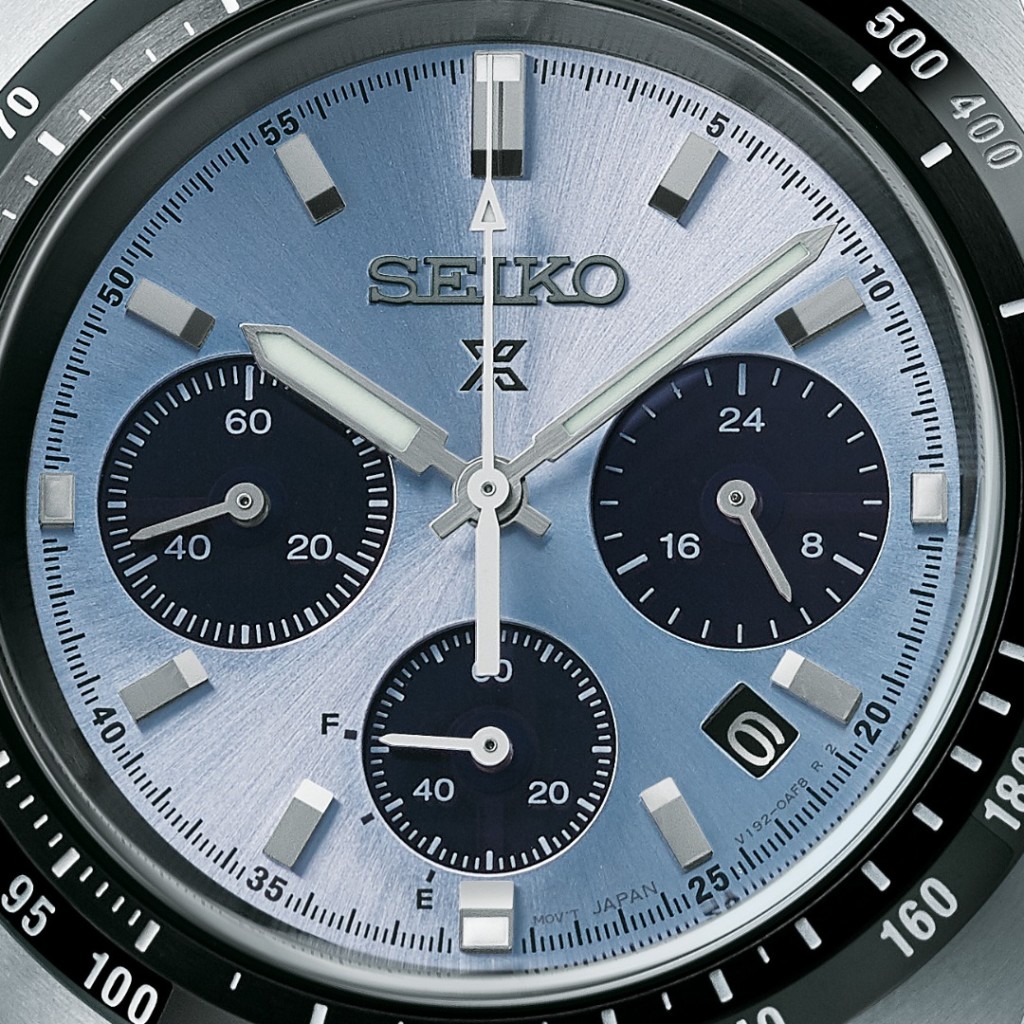 Starting with the dial, the Seiko Prospex Speedtimer ‘Crystal Trophy’ SSC909P1 watch instantly stands out from the Speedtimer chronographs from last year with a crisp, pale blue backdrop and contrasting black chronograph counters in a tri-compax layout. The blue centre adopts sunray finishing for beautiful reflection of the light in honour of the glow of crystal trophies. Meanwhile, the black chronograph counters are kept smooth and are adorned in white printed lettering. At the centre, the classic hour and minute hands feature Lumibrite inserts and the chronograph seconds hand is adorned in white.