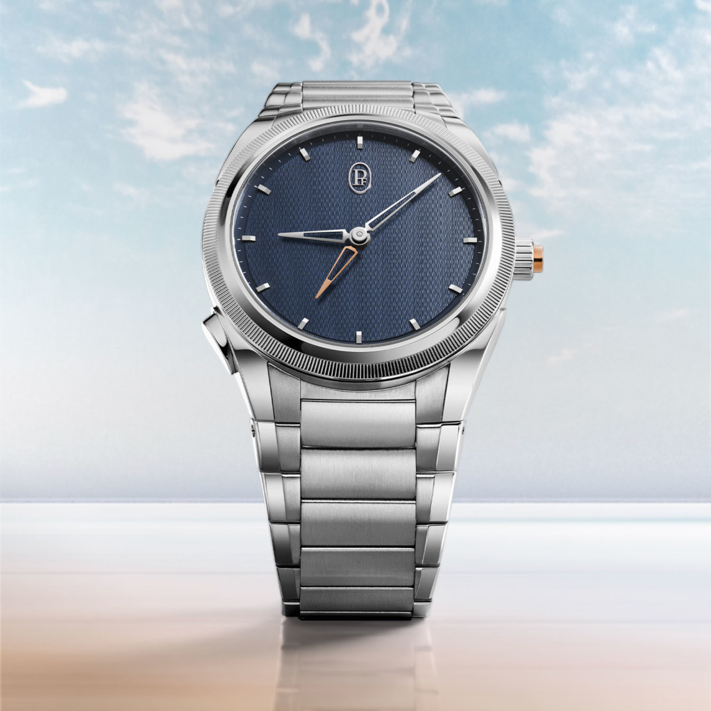 At the centre, the Parmigiani Fleurier Tonda PF GMT Rattrapante watch opts for a breathtaking Milano blue dial finished with the unique grain d’orge guilloché pattern which can be found on many of the pieces in the Tonda PF collection. At the centre, the brand’s redesigned oval logo is applied at 12 o’clock and the three hands, finished in rhodium-plated gold or 18ct rose gold, are skeletonised and delta-shaped. Powering the hands of the Parmigiani Fleurier Tonda PF GMT Rattrapante watch is the automatic winding Calibre PF051 offering a frequency of 21,600vph and a power reserve of 48 hours. The movement has been created in-house by the Swiss watch manufacturer and can be admired through the exhibition case back where you can see Côtes de Genève and perlage decoration and a 22ct rose gold micro-rotor adorned with a guilloche pattern.