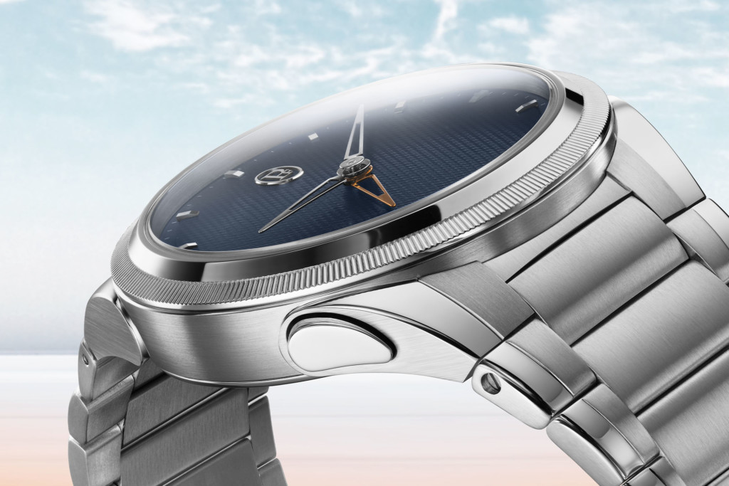 - Dial: “Milano Blue” with grain d’orge guilloche, 18ct gold rhodium-plated indexes and hour and minute hands for local time, 18ct rose gold hand for home time