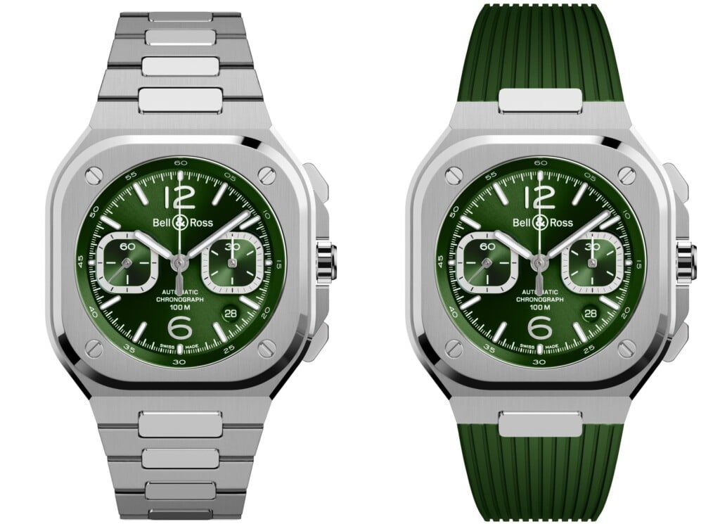 The new green dial of the Bell & Ross BR 05 Green Steel watch is – quite literally – a breath of fresh air. The metallic green hue has never been placed on a BR 05 watch before with a steel case, previously only appearing on the more opulent BR 05 Gold. The glossy green sunray centre pairs beautifully with the polished accents of the square-shaped case and the choice of a green ribbed rubber strap or integrated steel bracelet. The dial is joined by two matching green subsidiary counters at 3 and 9 o’clock for the small seconds and chronograph minutes, each with snailed decoration and recessed silver tracks for easy legibility. The rest of the Bell & Ross BR 05 Green Steel watch’s dial follows suit providing clear readability with two large silver numerals for the 12 and 6 o’clock markers, stick indexes and thick baton hands, all with glow in the dark Superluminova inserts.