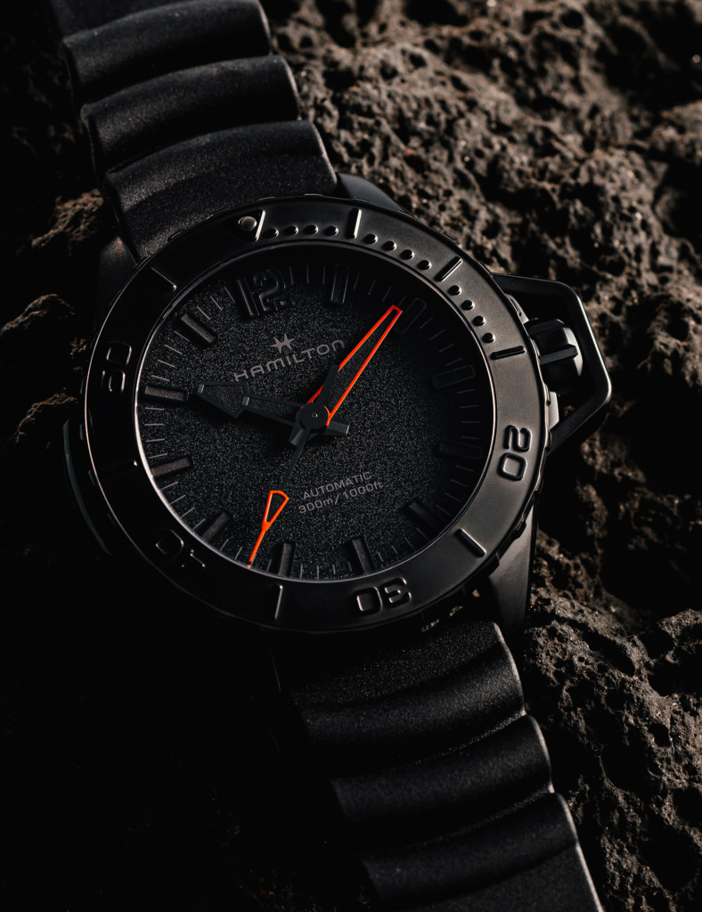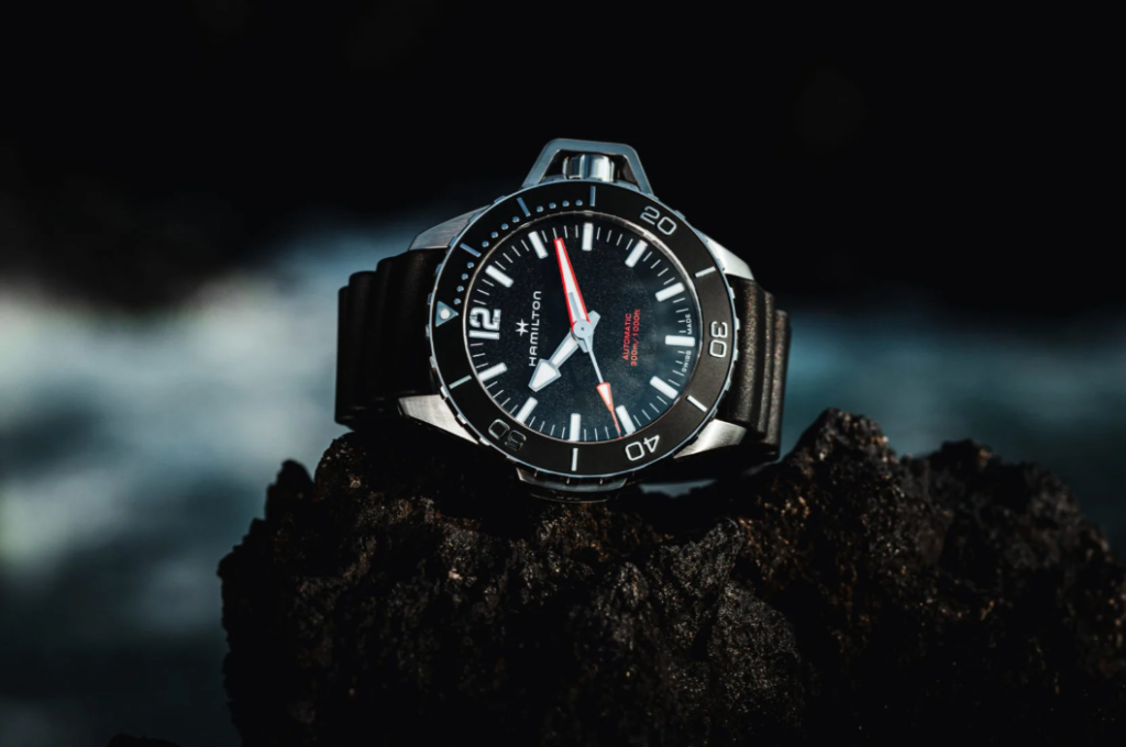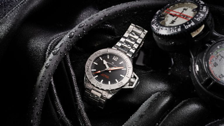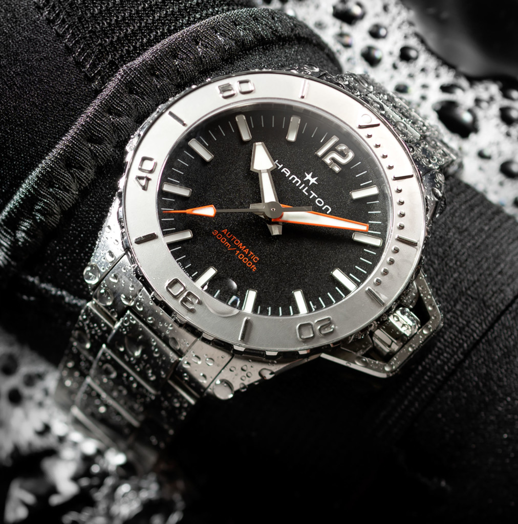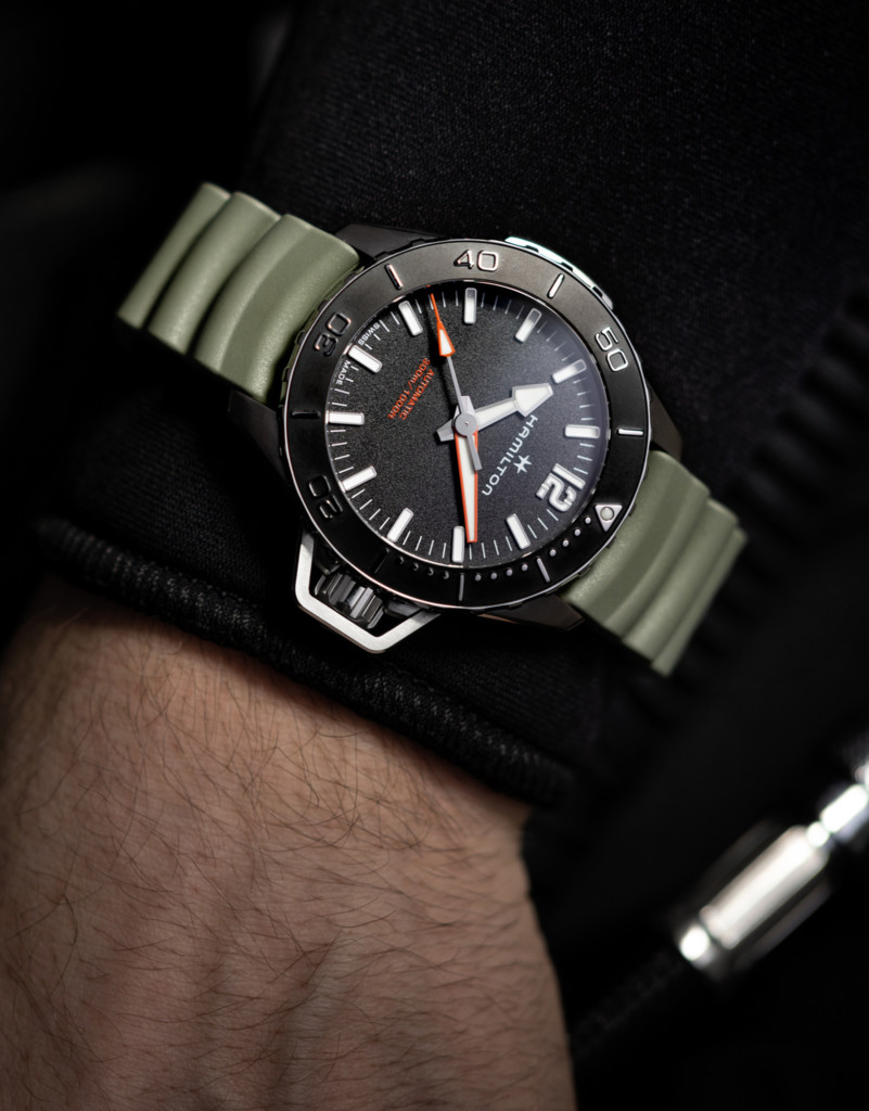 The history of the Hamilton Khaki Navy Frogman can be traced back to 1943 when the inaugural US Navy underwater demolition team was formed. The unit, known as the Naval Combat Demolition Units (NCDUs), was assigned to clear mines and other obstacles in preparation for land invasions during the Second World War and as such, were provided with one of Hamilton’s very first waterproof wristwatches. The design featured a large screw cap for improved water resistance and a technical, durable profile to survive challenging missions. Then in 1951, what became known as the Hamilton Frogman, was portrayed on screen in the movie The Frogmen which retold the stories of the underwater demolition teams. Then in 2016, the Swiss watch manufacturer revived the design as a set of 46mm divers watches suited more to the wrists of saturation divers than military personnel.