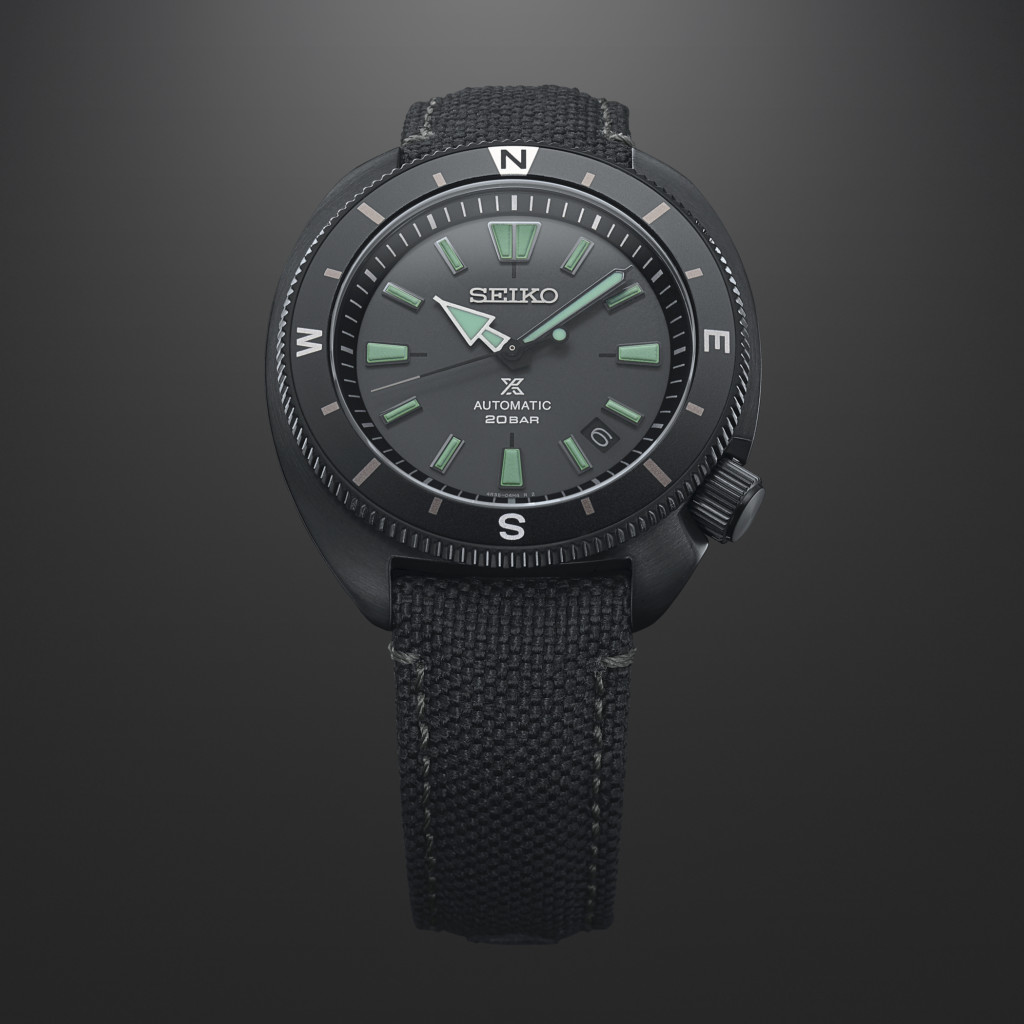 The second watch in the new 2022 Seiko Prospex Black Series collection is a Seiko Tortoise, a design which was only recently launched as an evolution from the famous Seiko Turtle. The Seiko Turtle has always been part of their “Sea” series designed for divers with a 60 minute unidirectional divers bezel. Then last year, the same case shape was renamed as the Seiko Prospex Tortoise watch, replacing the diver’s bezel with a compass bezel for use not underwater, but on land. The new Seiko Prospex Black Series ‘Night Vision’ Tortoise SRPH99K1 offers the very same with a blackened aluminium insert unidirectional bezel set with the four cardinal points.