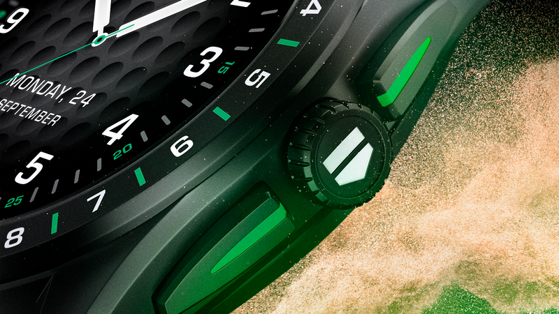 Available only to owners of the new TAG Heuer Connected Calibre E4 Golf Edition watch is a new watch face inspired by the sport. It comes in black with accents of the watch’s trademark green colour and is detailed with subtle accents designed to evoke the dimples of a golf ball. The new watch face perfectly pairs with the trademark strap and makes it appear as if the strap continues off screen and around your wrist. You’ll also get all the classic Connected watch faces too including the famous Carrera Skeleton face and the new Riverside’ watch face which animates a futuristic effect to show time elapsing.