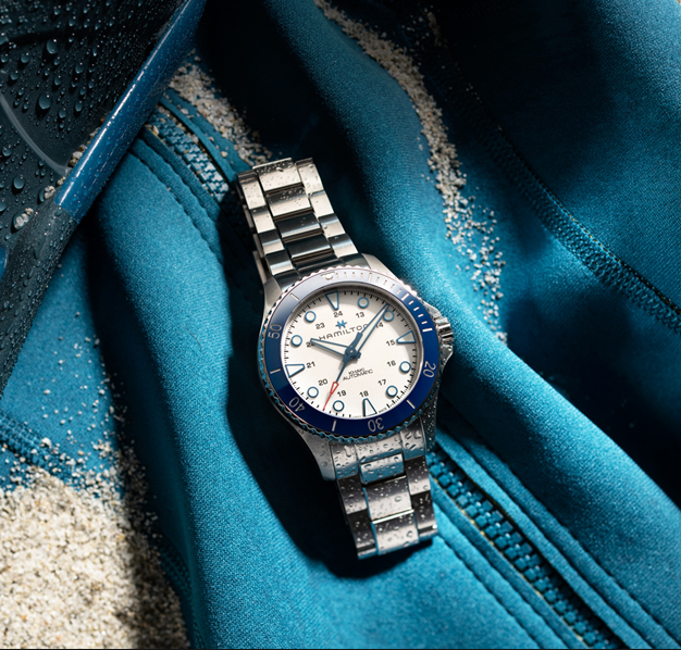 Joining the new Hamilton Khaki Navy Scuba Auto 43mm series is a new white-dialled model under reference H82505150. It’s a stunning summer-ready piece “designed to inspire adventures in the sun, sand and sea.” The dial maintains the clean aesthetics of the rest of the collection but with a new blue steel treatment for a nice contrast against the paper-white backdrop. Blue steel makes up the long sword-shaped hands for the hours and minutes, the combination of round and trapezoid-shaped markers and the slender seconds hand which turns from blue to red at the tip. Much of the hardware is filled with Swiss Superluminova for additional readability in low lighting. The dial of the new Hamilton Khaki Navy Scuba Auto White watch also presents the new 24 hour scale inwards of the hour markers in black.