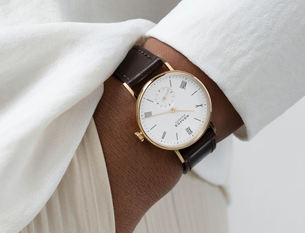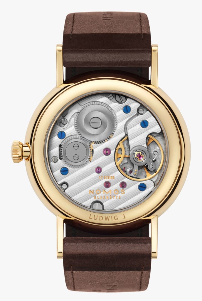 The perfectly round case of the NOMOS Ludwig Gold 33 watch is crafted from 18 carat 3N gold and shares the brand’s classic design language with a minimalistic approach, sloping lugs and a height of only 6.6 millimetres. The case also reveals a thin unadorned bezel, a small knurled non-screw locked crown at 3 o’clock and a splash-proof 30 metre water resistant rating. Securing the unisex watch to the wrist is a Horween Genuine Shell Cordovan strap in brown with tone-on-tone stitching and a matching 18ct gold winged clasp.