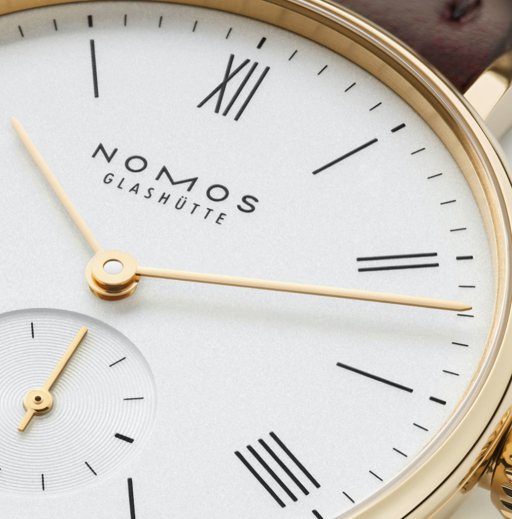The dial is as equally stand-out as the gold case, finished in white silver-plating and dressed in minimalistic hardware for the telling of the hours, minutes and small seconds. At the centre of the NOMOS Ludwig Gold 33, two impressively slender hands demonstrate the hours and minutes while a third gold marker is placed at the centre of the snailed subsidiary dial for the seconds at 6 o’clock. The seconds track, minutes track and large Roman numerals are printed in black for the ultimate contrast against the crisp white backdrop.