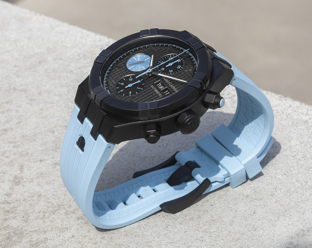 Like the pastel blue elements on the dial, the strap breaks up what would otherwise be an entirely all-black watch with a charming light blue finish. The strap is engineered from FKM rubber and is secured by a black DLC pin buckle. Like all Aikon watches, the strap of the Maurice Lacroix Aikon Sprint Chronograph is also decorated with the brand’s ‘M’ logo, matching the rest of the aesthetic with a polished black coating.