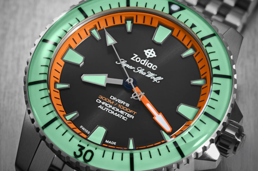 Contrasting to the seafoam green bezel is a blazing orange minutes scale which slopes down into the flat matte base of the dial. The dial of the Zodiac Super Sea Wolf Titanium Pro-Diver Limited Edition is as equally readable as the rest of the design set with large luminous hour markers, a green lume hour hand and a contrasting orange luminous minutes hand. The seconds hand also receives an arrow-shaped tip that glows in the dark. Completing the black display is the printed Zodiac logo and markings to depict its water resistance and chronometer status.