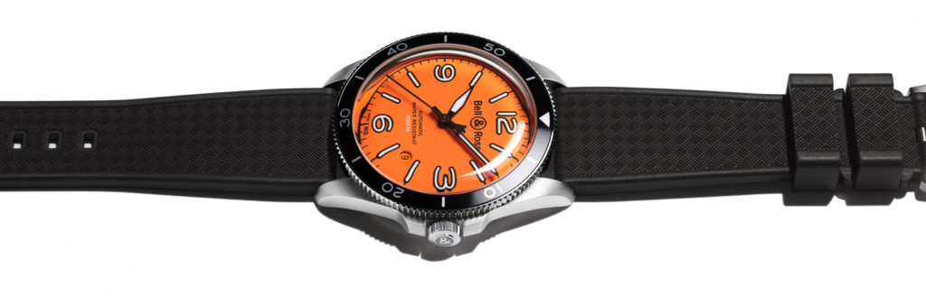 There are two strap options for the Bell & Ross BR V2-92 Orange watch. The first is a stainless steel bracelet with a classic three-link profile, satin-finished surfaces and a folding buckle. The second is a supple black rubber strap secured by a classic satin-finished pin buckle. Both designs fit nicely with the aesthetic of the Bell & Ross BR V2-92 Orange watch, the rubber band bringing out the sporty personality of the orange dial while the steel bracelet is more suited to those preferring of a formal look.