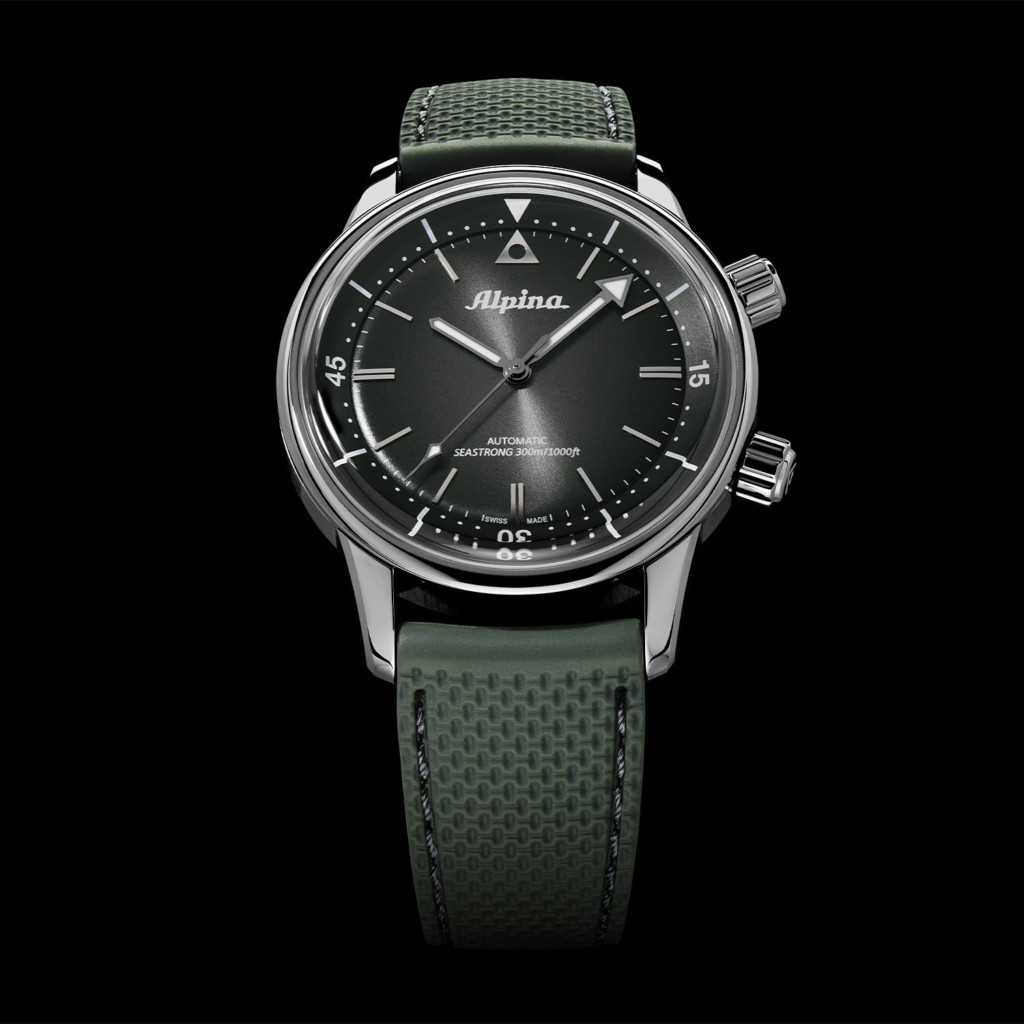 Reinvented with a dark green dial and strap, the new Alpina Seastrong Diver 300 Heritage watch retains its coveted vintage charm by bringing its modernised architecture together with aesthetics modelled after the Alpina 10 Seastrong, the brand’s very first Super Compressor.